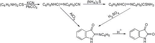 | 353. | Sandmeyer Diphenylurea Isatin Synthesis T. Sandmeyer, Z. Farb. Textile Chem. 2, 129 (1903). Formation of a cyanoformamidine by treatment of a symmetrical diphenylthiourea with potassium cyanide in alcohol containing lead carbonate, reduction with ammonium sulfide and ring-closure with concentrated sulfuric acid to isatin-2-anil; also formed smoothly by ring closure of the cyanoformamidine with aluminum chloride in benzene or carbon disulfide:
