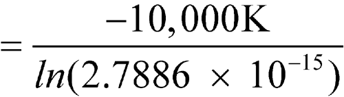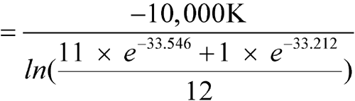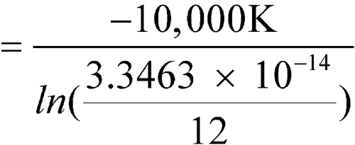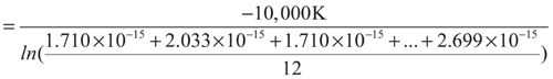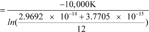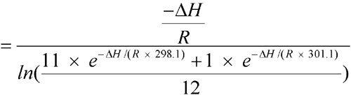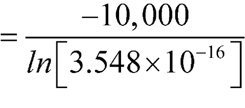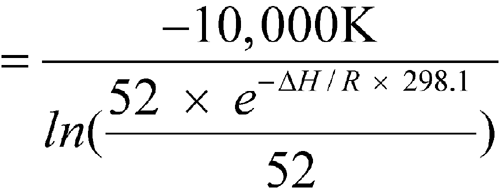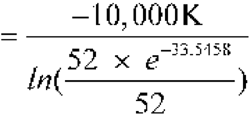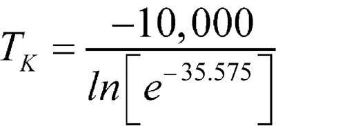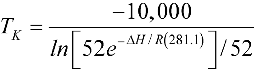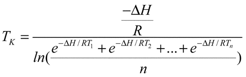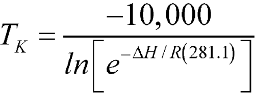 in which DH is the heat of activation, which equals 83.144 kJ per mol (unless more accurate information is available from experimental studies); R is the universal gas constant, which equals 8.3144 × 103 kJ per degree per mol; T1 is the average temperature, in degrees Kelvin, during the first time period, e.g., the first week; T2 is the average temperature, in degrees Kelvin, during the second time period, e.g., second week; and Tn is the average temperature, in degrees Kelvin during the nth time period, e.g., nth week, n being the total number of temperatures recorded. The mean kinetic temperature is calculated from average storage temperatures recorded over a one-year period, with a minimum of twelve equally spaced average storage temperature observations being recorded (see Pharmaceutical Stability