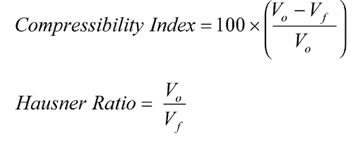 Although there are some variations in the method of determining the compressibility index and Hausner ratio, the basic procedure is to measure (1) the unsettled apparent volume, VO, and (2) the final tapped volume, Vf, of the powder after tapping the material until no further volume changes occur. The compressibility index and the Hausner ratio are calculated as follows: