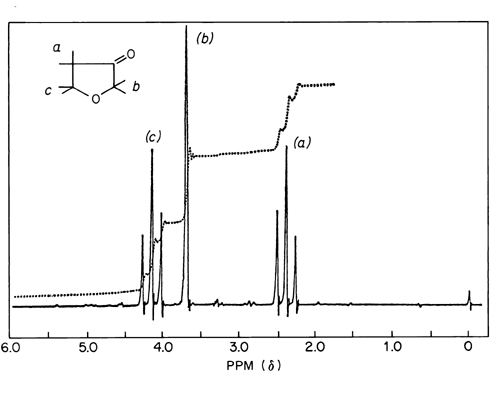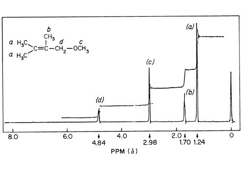 Figure 3 shows the proton NMR spectrum of 2,3-dimethyl-2-butenyl methyl ether. This compound contains protons in a methylene group (marked d in the graphic formula) and in four methyl groups (a, a, b, and c). Methyl groups b and c are situated in distinctly different molecular environments than the two a methyl groups. Three different methyl proton resonances are observed as spectral peaks in addition to the peak corresponding to methylene proton resonance. The two a methyl groups, being in very similar environments, have the same chemical shift. Interaction between magnetically active nuclei situated within a few bond lengths of each other leads to coupling, which results in a mutual splitting of the respective signals into sets of peaks or multiplets.
