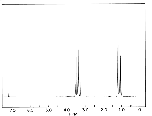 Instrument adjustments are made before each experiment. The spinning rate of the specimen tube is adjusted so that spinning side bands do not interfere with the peaks of interest and the vortex does not extend beyond the coils in the probe. To optimize the instrument performance, the magnetic shim gradients on FT-NMR spectrometers are adjusted. In adjusting resolution on CW spectrometers, a good indicator is the definite ringing of the TMS peak. The phenomenon of ringing is the oscillation of the recorder trace after the magnetic field has passed through a resonance frequency. Ringing, evident on a number of the peaks in Figures 5 and 6, arises during rapid scans and decays exponentially to the baseline value.