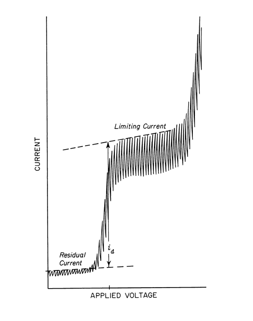 Since, in the case of the DME, the electrode surface is being constantly renewed in a cyclic fashion, the current increases from a small value as the drop begins to form to a maximum value as the drop falls. By the use of a suitable recorder to measure the current, the characteristic saw-toothed record is obtained. The limiting current is the sum of the residual and the diffusion currents. The residual current is subtracted from the limiting current to give the wave height.