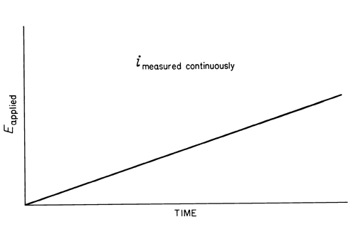 In direct current (dc) polarography, the microelectrode is a dropping mercury electrode (DME) consisting of small reproducible drops of mercury flowing from the orifice of a capillary tube connected to a mercury reservoir. A saturated calomel electrode (SCE) with a large surface area is the most commonly employed reference electrode. As the voltage applied to the cell increases, only a very small residual current flows until the substance under assay undergoes reduction or oxidation. Then the current increases, at first gradually, then almost linearly with voltage, and it gradually reaches a limiting value as is shown in Figure 1.