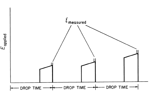 Differential pulse polarography is a technique whereby a fixed-height pulse applied at the end of the life of each drop is superimposed on a linear increasing dc ramp (see Figure 5).