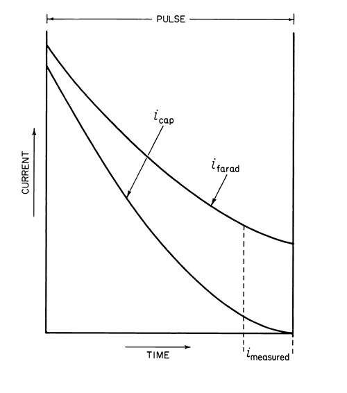 Each succeeding drop has a slightly higher pulse applied to it, with the rate of increase being determined by the selected scan rate. The current is measured at the end of the pulse where the capacitative current is nearly zero, and thus primarily faradaic current is measured (see Figure 4).
