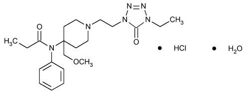 Propanamide, N-[1-[2-(4-ethyl-4,5-dihydro-5-oxo-1H-tetrazol-1-yl)ethyl]-4-(methoxymethyl)-4-piperidinyl]-N-phenyl, monohydrochloride, monohydrate. N-[1-[2-(4-Ethyl-5-oxo-2-tetrazolin-1-yl)-ethyl]-4-(methoxymethyl)-4-piperidyl]propionanilide monohydrochloride monohydrate » Alfentanil Hydrochloride contains not less than 98.0 percent and not more than 102.0 percent of C21H32N6O3·HCl, calculated on the anhydrous basis.