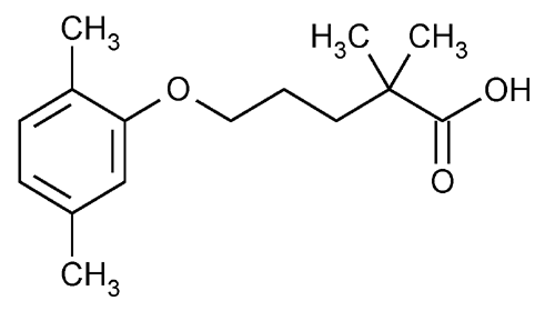 Pentanoic acid, 5-(2,5-dimethylphenoxy)-2,2-dimethyl-. 2,2-Dimethyl-5-(2,5-xylyloxy)valeric acid » Gemfibrozil contains not less than 98.0 percent and not more than 102.0 percent of C15H22O3, calculated on the anhydrous basis.