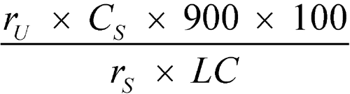 in which rU and rS are the peak areas of each drug substance in the Test solution and in the Standard solution, respectively; CS is the concentration of each drug substance, in mg per mL, in the Standard solution; 900 is the volume, in mL, of Medium; 100 is the conversion factor to percentage; and LC is the tablet label claim for each drug substance, in mg.