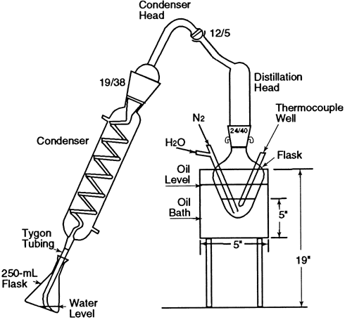 The boiling or reaction flask, consisting of a 125-mL conical-bottom boiling flask modified to provide a thermocouple (or thermometer) well and an inlet with a 1.0-mm capillary tip for nitrogen and water (see Fig. 2), is fitted with a distillation head that leads to a condenser. The reaction flask is immersed in an oil bath equipped with an electric heater capable of heating the bath at the desired rate and maintaining the temperature at 155