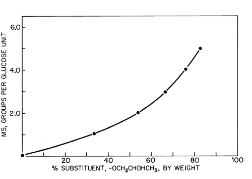 The results obtained as a percentage of hydroxypropoxy content may be converted to terms of average molecular substitution of glucose units by means of the accompanying graph (see Fig. 3).