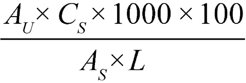 in which AU and AS are the absorbances obtained from the solution under test and the Standard solution, respectively; CS is the concentration, in mg per mL, of the Standard solution; 1000 is the volume, in mL, of Medium; 100 is the conversion factor to percentage; and L is the label claim, in mg, of irbesartan.