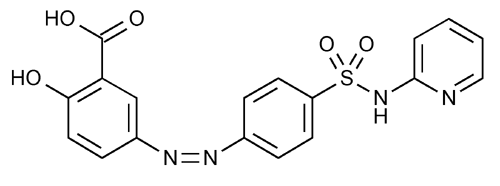 Benzoic acid, 2-hydroxy-5-[[4-[(2-pyridinylamino)sulfonyl]phenyl]azo]-. 5-[[p-(2-Pyridylsulfamoyl)phenyl]azo]salicylic acid » Sulfasalazine contains not less than 97.0 percent and not more than 101.5 percent of C18H14N4O5S, calculated on the dried basis.