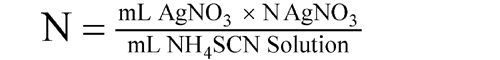 Accurately measure about 30 mL of 0.1 N silver nitrate VS into a glass-stoppered flask. Dilute with 50 mL of water, then add 2 mL of nitric acid and 2 mL of ferric ammonium sulfate TS, and titrate with the ammonium thiocyanate solution to the first appearance of a red-brown color.