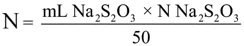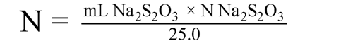 Accurately measure about 25 mL of the solution into a 500-mL iodine flask, and dilute with 120 mL of water. Add 5 mL of hydrochloric acid, insert the stopper in the flask, and shake it gently. Then add 5 mL of potassium iodide TS, again insert the stopper, shake the mixture, allow it to stand for 5 minutes, and titrate the liberated iodine with 0.1 N sodium thiosulfate VS, adding 3 mL of starch TS as the endpoint is approached.