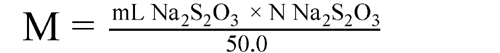 Accurately measure about 40 mL of the solution into a glass-stoppered flask, add 5 mL of hydrochloric acid, mix, and add a solution of 3 g of potassium iodide in 10 mL of water. Insert the stopper, allow to stand for 10 minutes, then titrate the liberated iodine with 0.1 N sodium thiosulfate VS, adding 3 mL of starch TS as the endpoint is approached. Correct for a blank run on the same quantities of the same reagents.