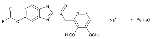 1H-Benzimidazole, 5-(difluoromethoxy)-2-[[(3,4-dimethoxy-2-pyridyl)methyl]sulfinyl]-, sodium salt, hydrate (2:3). 5-(Difluoromethoxy)-2-[[(3,4-dimethoxy-2-pyridyl)methyl]sulfinyl]benzimidazole, sodium salt, sesquihydrate » Pantoprazole Sodium contains not less than 98.0 percent and not more than 102.0 percent of C16H14F2N3NaO4S, calculated on the anhydrous basis.