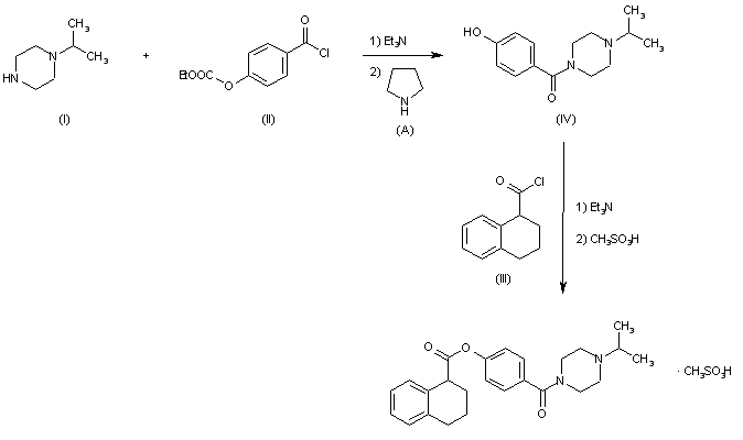 4-(4-isopropylpiperazinocarbonyl)phenol (IV) is obtained by reaction of 1-isopropylpiperazine (I) and 4-ethoxycarbonyloxybenzoylchloride (II) in CHCl3 using triethylamine (Et3N) as a proton scavenger, followed by removing its ethoxycarbonyl group using pyrrolidine in ethylacetate. Also, the reaction in CHCl3 of 1,2,3,4-tetrahydro-1-naphtoyl chloride (III) and (IV) using Et3N, followed by neutralization of the medium using NaOH and by salt formation using CH3SO3H in ethanol, yields FK-448.