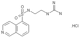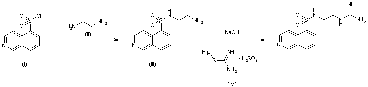 The reaction of 5-isoquinolinesulfonyl chloride (I) with ethyldiamine (II) in methylene chloride gives N-(2-aminoethyl)isoquinoline-5-sulfonamide (III), which is then condensed with S-methylisothiourea sulfate (IV) by means of NaOH at 80 C.