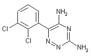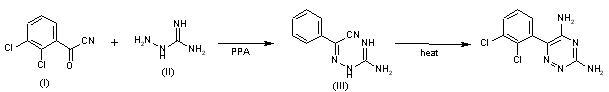Condensation of 2,3-dichlorobenzoyl cyanide (I) with aminoguanidine (II) by means of PPA in hot acetonitrile yields 2,3-dichlorobenzoyl cyanide amidinohydrazone (III), which is cyclized to the target 1,2,4-triazine by heating in refluxing propanol with or without DMSO.