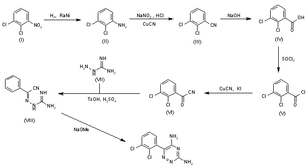 Hydrogenation of 2,3-dichloronitrobenzene (I) with H2 over Ra-Ni in methanol gives 2,3-dichloroaniline (II), which is diazotized with NaNO2 and HCl and treated with CuCN to yield 2,3-dichlorobenzonitrile (III). Hydrolysis of the nitrile (III) with NaOH in refluxing methanol/water affords 2,3-dichlorobenzoic acid (IV), which is treated with hot SOCl2 to provide the corresponding acyl chloride (V). Reaction of (V) with CuCN and KI in refluxing chlorobenzene gives 2,3-dichlorobenzoyl cyanide (VI), which is condensed with aminoguanidine (VII) by means of H2SO4/TsOH in hot toluene to yield 2,3-dichlorobenzoyl cyanide amidinohydrazone (VIII). Finally, this compound is cyclized by treatment with NaOMe in refluxing methanol.
