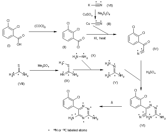 The reaction of 2,3-dichlorobenzoic acid (I) with oxalyl chloride in dichloromethane gives the acyl chloride (II), which is condensed with labeled copper cyanide (III) by means of KI in refluxing xylene to yield the 2,3-dichlorobenzoyl cyanide (IV). The condensation of (IV) with labeled aminoguanidine (V) by means of sulfuric acid in acetonitrile/water affords adduct (VI), which is finally cyclized by refluxing under the conditions of the preceding reaction to provide the target labeled diaminotriazine. The intermediate labeled copper cyanide (III) has been obtained by reaction of CuSO4 with labeled potassium cyanide (VII) and Na2S2O5 in hot water. The intermediate labeled aminoguanidine (V) has been obtained by methylation of thiourea (VIII) with dimethyl sulfate in boiling water to give S-methylisothiourea (IX), which is finally treated with hydrazine (X) and NaOH in water.