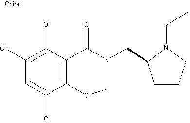 The reaction of 3,5-dichloro-6-methoxysaliclic acid (I) with refluxing SOCl2 gives the corresponding acyl chloride (II), which is condensed with 1-ethyl-2-(aminomethyl)pyrrolidine (III) in methylene chloride yielding the amide (IV). Finally, this compound is partially demethylated with BBr3 in methylene chloride ether.