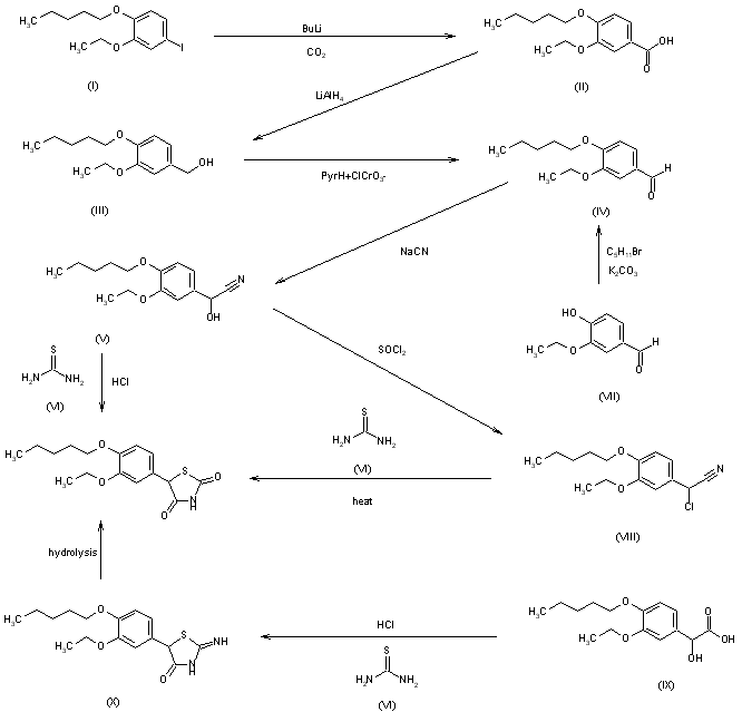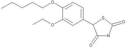 This compound can be obtained by three related ways: 1) The carboxylation of 3-ethoxy-4-pentyloxyiodobenzene (I) with CO2 and butyllithium in ether gives 3-ethoxy-4-pentyloxybenzoic acid (II), which is reduced with LiAlH4 in refluxing ether to yield the corresponding benzyl alcohol (III). The controlled oxidation of (III) with pyridinium chlorochromate in dichloromethane affords 3-ethoxy-4-pentyloxybenazldehyde (IV), which is treated wtih NaCN and acetic acid - water giving 2-(3-ethoxy-4-pentyloxyphenyl)-2-hydroxyacetonitrile (V). Finally, this compound is cyclized with thiourea (VI) and HCl in 2-methoxyethanol. 2) The alkylation of ethyl-vanilline (VII) with c and K2CO3 in hot DMF gives aldehyde (IV), which by reaction with NaCH in methanol - HCl yields the cyanohydrine (V). The reaction of (V) with SOCl2 in refluxing CHCl3 affords 2-chloro-2-(3-ethoxy-5-pentyloxyphenyl)acetonitrile (VIII), which is finally cyclized with thiourea (VI) in ethylene glycol monomethyl ether - HCl at 110 C in refluxing ethanol - HCl. 3) The cyclization of 2-(3-ethoxy-4-pentyloxyphenyl)-2-hydroxyacetic acid (IX) with thiourea (VI) under acidic conditions gives 5-(3-ethoxy-4-pentyloxyphenyl)-2-iminothiazolidin-4-one (X), which is then hydrolyzed to the desired product.