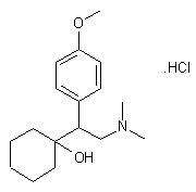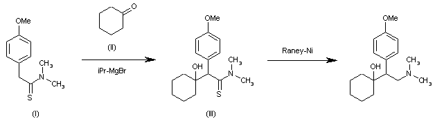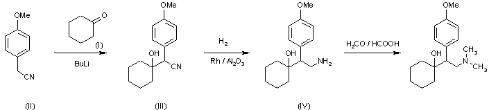 The condensation of cyclohexanone (I) with 4 methoxyphenylacetonitrile (II) by means of n-butyllithium in THF gives 2-(1-hydroxycyclohexyl)-2-(4-methoxyphenyl) acetonitrile (III), which is reduced with H2 over Rh/A12O3 in ethanol-ammonia yielding 1-[2-amino-1-(4 methoxyphenyl)ethyl]cyclohexanol (IV). Finally, this compound is methylated with formaldehyde and formic acid in refluxing water.