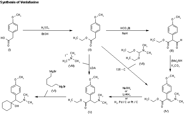 A new process for the production of venlafaxine has been reported: Esterification of 2-(4-methoxyphenyl)-acetic acid (I) with ethanol and sulfuric acid gives the corresponding ethyl ester (II), which is condensed with ethyl formate by means of NaH to yield 2-formyl-3-(4-methoxyphenyl)acetic acid ethyl ester (III). Reaction of (III) with dimethylamine and K2CO3 in EtOH affords 3-(dimethylamino)-2-(4-methoxyphenyl)acrylic acid ethyl ester (IV), which is reduced with either NaBH4, LiAlH4 or H2 over Pd/C or Pt/C in ethanol to provide the corresponding propionic ester (V). Finally, this compound is cyclized with the bismagnesiane (VI) in THF. Alternatively, acrylic ester (IV) can be obtained directly by condensation of acetate (II) with dimethylformamide diethylacetal (VII) at 135 C. Alternatively, propionic ester (V) can be obtained by condensation of acetate (II) with N,N-dimethylmethylene-iminium iodide (VIII) by means of LDA in THF/heptane/ ethylbenzene.
