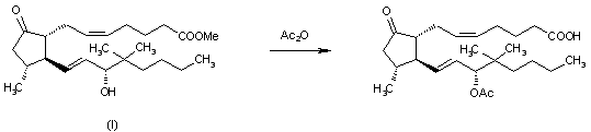 By acetylation of 15-hydroxy-11,16,16-trimethyl-9-oxoprosta-5,13-dienoic acid (I) with acetic anhydride and 4-(dimethylamino)pyridine-triethylamine at room temperature.