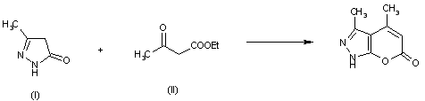 Suspension of 3-methyl-2-pyrazolin-5-one (I) is added dropwise under stirring to ethyl acetoacetate (II), which has been heated to 140 C, water and ethanol formed in the reaction are distilled off, and the mixture is heated at reflux. Upon completion of the reaction, the mixture is allowed to stand at room temperature, and the solid thus separated is collected and recrystallized from ethanol to obtain the title compound.