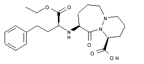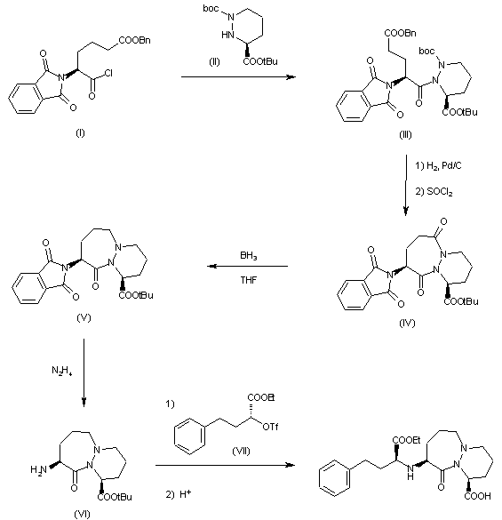 The condensation of acyl chloride (I) with hexahydropyridazine (II) gives the corresponding amide (III), which is debenzylated with H2 over Pd/C and cyclized by means of SOCl2 to yield the pyridazinodiazepinedione (IV). Selective reduction of (IV) with borane in THF affords the pyridazinodiazepinone (V), which is treated with hydrazine to provide (1S,9S)-9-amino-10-oxoperhydropyridazino[1,2-a]azepine-1-carboxylic acid tert-butyl ester (VI). Finally, this compound is condensed with 4-phenyl-2(R)-(trifluoromethanesulfonyloxy)butyric acid ethyl ester (VII) and selectively hydrolyzed to afford the target carboxylic acid.