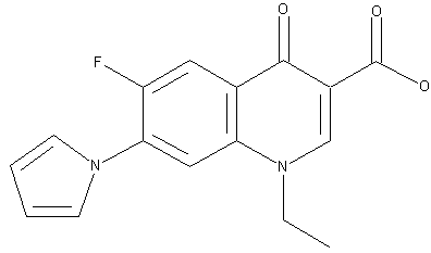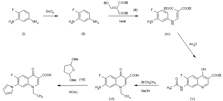The reduction of 4-fluoro-3-nitroaniline (I) with SnCl2.2H20 in concentrated aqueous HCl gives 4 fluoro-m-phenylenediamine (II), which is condensed with diethyl ethoxymethylenemalonate (III) in refluxing ethanol to afford diethyl 4-fluoro-3-aminoanilinomethylenemalonate (IV). The cyclization of (IV) by means of acetic anhydride in diphenyl oxide at 250 C yields ethyl 7-acetamido-4-hydroxy-6-fluoroquinoline-3-carboxylate (V), which is alkyiated with ethyl bromide and NaOH in refluxing ethanol to give 7-amino-6-fluoro-1-ethyl-1,4 dihydro-4-oxoquinoline-3-carboxylic acid (VI). Finally, this compound is condensed with 2,5-dimethoxytetrahydrofuran (VII) in hot acetic acid.