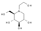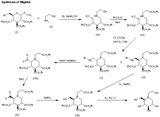 A new synthesis of miglitol has been reported: Reaction of the bromoglycoside (I) with ethanolamine (II) by means of Zn and NaBH3CN in refluxing propanol/water gives the adduct (III), which is benzylated with benzyl chloride and NaH in DMF yielding compound (IV). The cyclization of (IV) by means of mercury trifluoroacetate in THF, followed by a treatment with KHCO3 and KBr affords a mixture of the diastereomeric organomercuric piperidines (V) and (VI) which are separated by chromatography. The desired diastereomer (VI) was treated with O2 and NaBH4 in DMF to give the protected piperidinemethanol (VII), which is finally debenzylated by hydrogenolysis with H2 over Pd/C in ethanol. The undesired diastereomer (V) can be recovered by Swern oxidation giving aldehyde (VIII), isomerization of (VIII) with DBU to provide aldehyde (IX) and reduction of (IX) to the already reported piperidinemethanol (VII).
