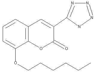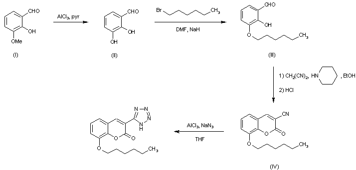| 合成路线图解说明: The demethylation ot o-vanillin (I) with AlCl3 dissolved in pyridine gives 2,3 dihydroxybenzaldehyde (II). Subsequent alkylation by means of hexyl bromide with NaH gives 3-hexyloxy-2-hydroxybenzaldehyde (III), which is then condensed with malononitrile and piperidine, yielding 3-cyano-8-hexyloxycromen-2-one (IV), a needle-like yellow crystalline substance. Finally, compound (IV) is treated with sodium azide and AlCl3 in refluxing THF, yielding the formation of the tetrazole ring. |