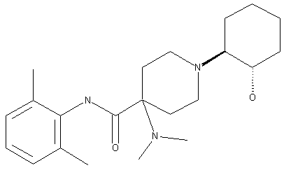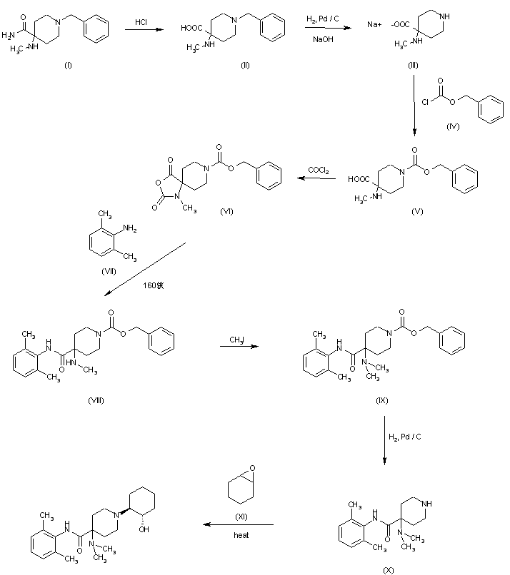 The hydrolysis of 1-benzyl-4-(methylamino)piperidine-4-carboxamide (I) with refluxing concentrated aqueous HCl gives the corresponding free acid (II), which is debenzylated with H2 over Pd/C in basic medium yielding 4-(methylamino)piperidine-4-carboxylic acid sodium salt (III). The protection of (III) with benzyl chloroformate (IV) in basic THF - water affords 1-(benzyloxycarbonyl)-4-(methylamino)piperidine 4 carboxylic acid (V), which by cyclization with phosgene in dioxane is converted to benzyl 1-methyl-2,4-dioxo 3-oxa-1,8-diazaspiro[4.5]decane-8 carboxylate (VI). The reaction of (VI) with 2,6-dimethylaniline (II) by heating at 160 C gives benzyl 4-(2,6-dimethylphenylaminocarbonyl)-4-(methylamino)piperidine-1-carboxylate (VIII), which is methylated with refluxing methyl iodide to the corresponding dimethylamino compound (IX). The deprotection of (IX) with H2 over Pd/C in methanol yields 4-(dimethylamino)-N-(2,6-dimethylphenyl)piperidine-4-carboxamide (X), which is finally condensed with 1,2-epoxycyclohexane (XI) in refluxing ethanol.