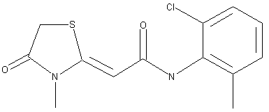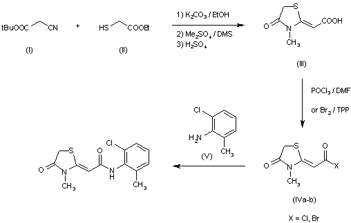 Reaction of tert-butyl cyanoacetate (I) with ethyl mercaptoacetate (II) in the presence of potassium carbonate, followed by N-methylation and ester cleavage affords the intermediate carboxylic acid (III). This compound, by POCl3 in dimethylformamide or by Br2/TPP, is converted to the corresponding acid halogenide (IV), which is finally condensed with 2-chloro-6-methylaniline (V).