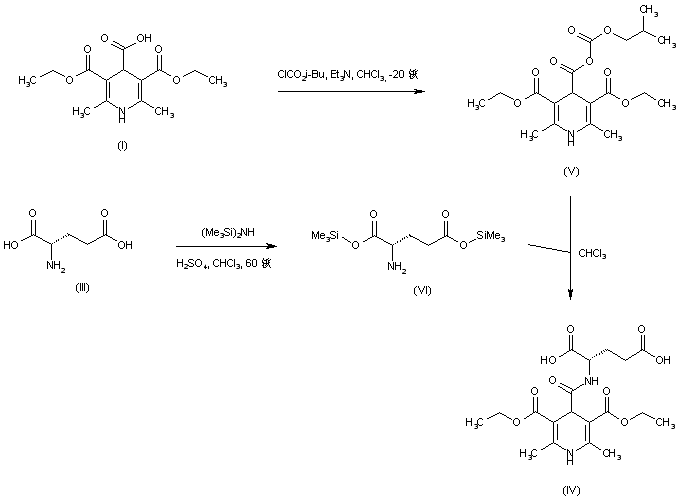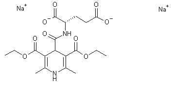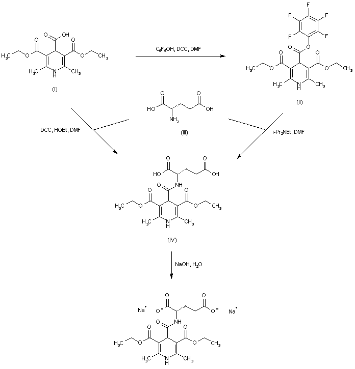The dihydropyridine-4-carboxylic acid derivative (I) was activated as the pentafluorophenyl ester (II) using pentafluorophenol and DCC. Coupling of the active ester (II) with glutamic acid (III) furnished the N-acyl glutamic acid (IV). Alternatively, (IV) was obtained by coupling of glutamic acid (III) with the pyridine acid (I) via activation with DCC/HOBt. Diacid (IV) was finally treated with NaOH to produce the corresponding disodium salt.