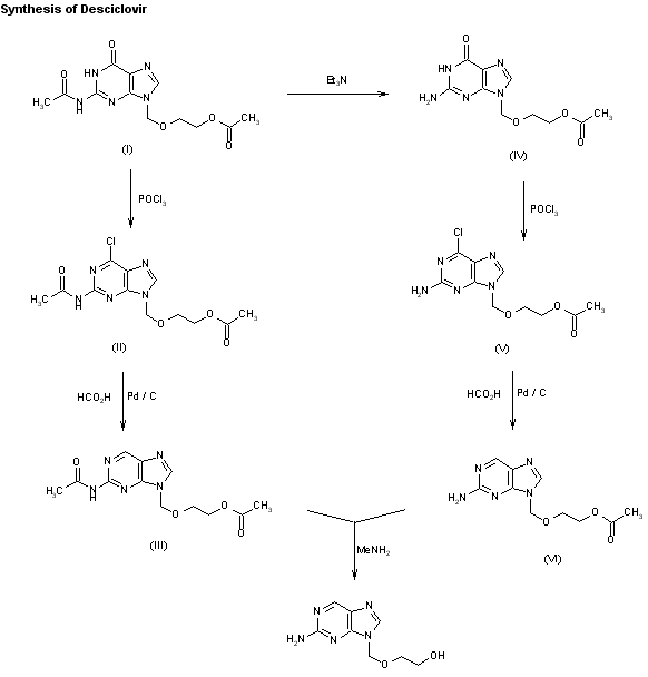 A new synthesis of A-515-U has been reported. The compound can be synthesized in two similar ways: 1) The reaction of 9-(2-acetoxyethoxymethyl)-2-(acetylamino)-6,9-dihydro-1H-purin-6-one (I) with POCl3 and 2,4,6-trimethylpyridine in refluxing acetonitrile gives 9-(2-acetoxyethoxymethyl)-2-(acetylamino)-6-chloro-9H-purine (II), which is dechlorinated with formic acid - triethylamine and Pd/C in refluxing acetone, yielding 9-(2-acetoxyethoxymethyl)-2-(acetylamino)-9H-purine (III). Finally, this compound is deacetylated in water. 2) Purine (I) is partially deacetylated with triethylamine in refluxing ethanol to give 9-(2-acetoxyethoxymethyl)-2-amino-6,9-dihydro-1H-purin-6-one (IV), which is treated with POCl3 as before to yield the chloropurine (V). The dechlorination of (V) with HCO2H as before or with ammonium formate - Pd/C affords 9-(2-acetoxyethoxymethyl)-2-amino-9H-purine (VI), which is finally deacetylated with methylamine as before.