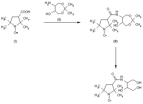 Reaction of 2,2,5,5-tetramethylpyrrolidin-1-oxyl-3-carboxylic acid (I) with 6-amino-2,2-dimethyl-1,3-dioxepan-5-ol (II) yields 2,2,5,5-tetramethylpyrrolidin-1-oxyl-3-carboxylic acid (5-hydroxy-2,2-dimethyl-1,3-dioxepan-6-yl)amide (III). Subsequent acidic hydrolysis gives NAT.