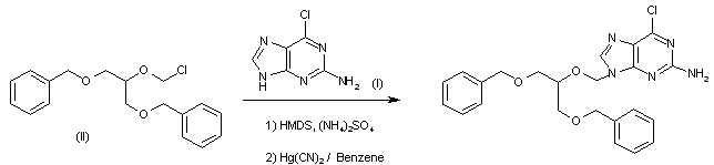 By the condensation of 2-amino-6-chloropurine (I) (which has been silylated with 1,1,1,3,3,3-hexamethyldisilazane) with (1,3-dibenzyloxy-2-propoxy)methyl chloride (II) by means of mercuric cyanide in benzene at reflux. BIOLF-7O is purified by chromatography over silica gel.