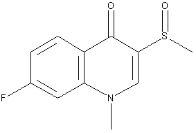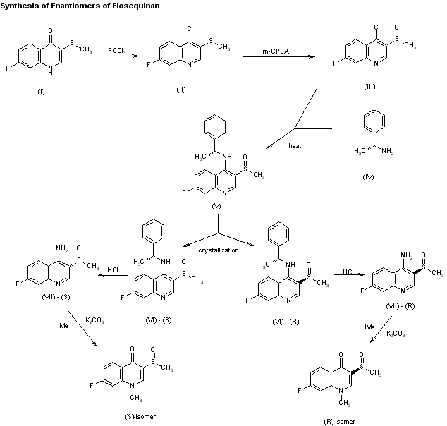 The synthesis of the two enantiomers of flosequinan has been described: The reaction of 7-fluoro-3-(methylsulfanyl)quinolin-4(1H)-one (I) with POCl3 in refluxing CHCl3 gives the corresponding chloroquinoline (II), which by oxidation with m-chloroperbenzoic acid (m-CPBA) in CHCl3/water yields 4-chloro-7-fluoro-3-(methylsulfinyl)quinoline (III). The condensation of (III) with (R)-1-phenylethylamine (IV) affords the secondary amine (V) as a diastereomeric mixture that is separated by fractional crystallization to afford the two diastereomers (VI)-(S) and (VI)-(R). Both compounds are treated with hot 1N HCl to afford (S)-4-amino-7-fluoro-3-(methylsulfinyl)quinoline (VII)-(S) and (R)-4-amino-7-fluoro-3-(methylsulfinyl)quinoline (VII)-(R), respectively. Finally, (VII)-(S) and (VII)-(R) are treated with methyl iodide in hot butanone to afford (S)-flosequinan and (R)-flosequinan, respectively.