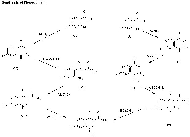 Flosequinan has been synthesized by two new related ways: 1) The reaction of 2-chloro-4-fluorobenzoic acid (I) with refluxing aqueous methylamine Cu powder and CuCl2 gives 4-fluoro-2-(methylamino)benzoic acid (II), which is cyclized with phosgene to yield 7-fluoro-1-methyl-1,2-dihydro-4H-3,1-benzoxazine-2,4-dione (III). The reaction of (III) with dimethyl sulfoxide and NaH in toluene affords 4-fluoro-2-(methylamino)-alpha-(methylsulfinyl)acetophenone (IV), which is finally cyclized with refluxing triethyl orthoformate. 2) The reaction of 2-amino-4-fluorobenzoic acid (V) with phosgene as before gives the corresponding benzoxazine (VI), which is treated with dimethyl sulfoxide and NaH in refluxing toluene to afford 2-amino-4-fluoro-alpha-(methylsulfinyl)acetophenone (VII). The cyclization of (VII) with refluxing trimethyl orthoformate gives 7-fluoro-3-(methylsulfinyl)quinolin-4(1H)-one (VIII), which is finally methylated with dimethyl sulfate and KOH in water.