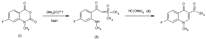 The reaction of 7-fluoro-1-methyl-3,1-benzoxazine-2,4-dione (I) with trimethylsulfoxonium iodide and NaH in DMSO gives the corresponding ylide (II), which is cyclized with methyl orthoformate (III) in refluxing ethanol-acetic acid.