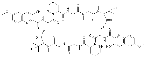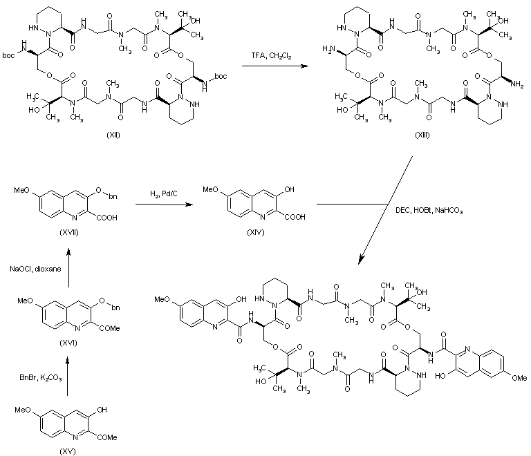 Boc groups of (XII) are cleaved with TFA in CH2Cl2 to furnish intermediate (XIII). Quinoline (XV) is protected with benzyl bromide and K2CO3 in acetone to give the benzyl-protected derivative (XVI), which is converted into the carboxylic acid (XVII) by treatment with NaOCl in dioxane. Debenzylation of (XVII) by hydrogenolysis over Pd/C in EtOAc yields intermediate (XIV), which finally acylates the primary amino groups in (XIII) by means of DEC, 1-hydroxy-1H-benzotriazole (HOBt) and NaHCO3 in DMF.