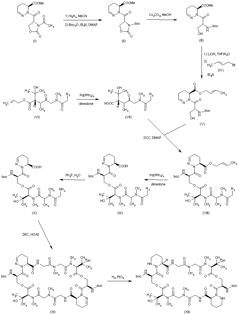The reaction of the acetyl-protected dipeptide (I) with N2H4 in acetonitrile followed by treatment with Boc2O, 4-dimethylaminopyridine (DMAP) and Et3N in dichloromethane affords the Boc-protected dipeptide (II). Oxazolone cleavage of (II) by means of Cs2CO3 in MeOH yields the methyl ester (III), which is converted into the crotyl ester (V) by a first hydrolysis with LiOH in THF/H2O followed by treatment with crotyl bromide (IV) and Et3N in acetone. Removal of the allyl moiety from peptide (VI) by means of Pd(PPh3)4 and dimedone in THF allows obtention of the carboxylic acid derivative (VII), which is then esterified with (V) by means of dicyclohexylcarbodiimide (DCC) and DMAP in CH2Cl2 to furnish (VIII). Removal of the crotyl moiety from (VIII) by means of Pd(PPh3)4 and dimedone in THF gives (IX), whose azide group is reduced with PPh3 in THF/H2O to afford amine (X). Self-assembling of (X) by spontaneous cyclodimerization when treated with 1-ethyl-3-[3-(dimethylamino)propyl]carbodiimide (DEC) and 1-hydroxy-7-aza-1H-benzotriazole (HOAt) produces dimer (XI), which is reduced by hydrogenation over PtO2 in EtOAc to provide (XII).