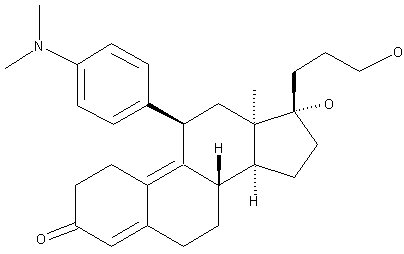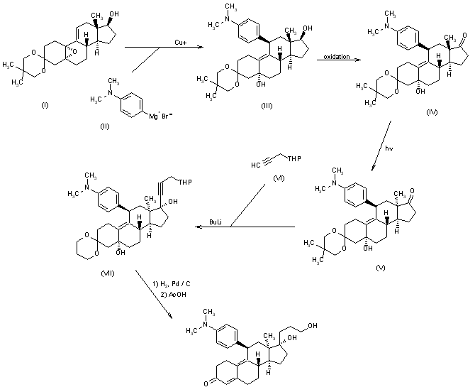The Grignard reaction of the protected epoxide (I) with 4-(dimethylamino)phenylmagnesium bromide (II) gives the 11-substituted compound (III), which is submitted to an Oppenhauer oxidation with cyclohexanone and aluminum isopropoxide yielding the 17-keto derivative (IV). The photochemical epimerization of the 13beta-methyl of (IV) with a high pressure mercury lamp in dioxane affords the epimer (V), which is condensed with 1-tetrahydropyranyloxy-2-propyne (VI) by means of butyllithium in THF to give the acetylenic alcohol (VII). Finally, this compound is reduced with hydrogen over Pd/C in ethanol and deprotected and dehydrated by treatment with hot aqueous acetic acid.