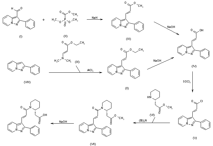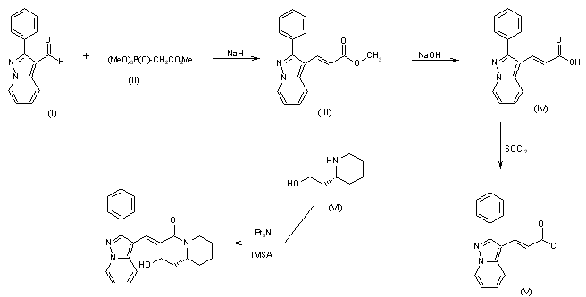 The Wittig condensation of 2-phenylpyrazolo[1,5-a]pyridine-3-carboxaldehyde (I) with trimethylphosphonoacetic acid methyl ester (II) by means of NaH in hot toluene gives 3(E)-(2-phenylpyrazolo[1,5-a]pyridin-3-yl)acrylic acid methyl ester (III), which is hydrolyzed with NaOH in methanol - water yielding the corresponding free acid (IV). The reaction of (IV) with SOCl2 in DMF affords the acyl chloride (V), which is finally condensed with 2(R)-(2-hydroxyethyl)piperidine (VI) by means of bis(trimethylsilyl)acetamide and triethylamine in dichloromethane.