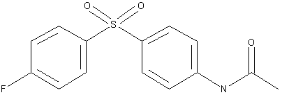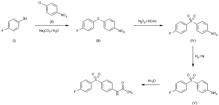 1) The reaction of p-fluorothiophenol (I) with p-chloronitrobenzene (II) in 50% aqueous ethanol in the presence of sodium carbonate gives p-fluorophenyl-p-nitrophenyl sulfide (III), which is then oxidized with 30% aqueous hydrogen peroxide in glacial acetic acid to give the corresponding sulfone (IV). The catalytic reduction of the sulfone (IV) with Raney Nickel in p-dioxane affords p-(p-fluorophenylsulfonyl)aniline (V), which is then acetylated with acetic anhydride in tetrahydrofuran to give title compound.