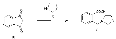 By reaction of phthalic anhydride (I) with thiazolidine (II) in CH2Cl2.